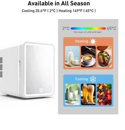 Cooling and Warming: The skincare mini fridge with mirror has two modes of heating and cooling. The low temperature can chill to 10-20˚C below ambient room temperature. Mirrored mini fridge can be used for preservation and freshness of medicines and fruits, cold drinks, cosmetics and skin care products. It can also maintain the temperature and heat to About 65°C.